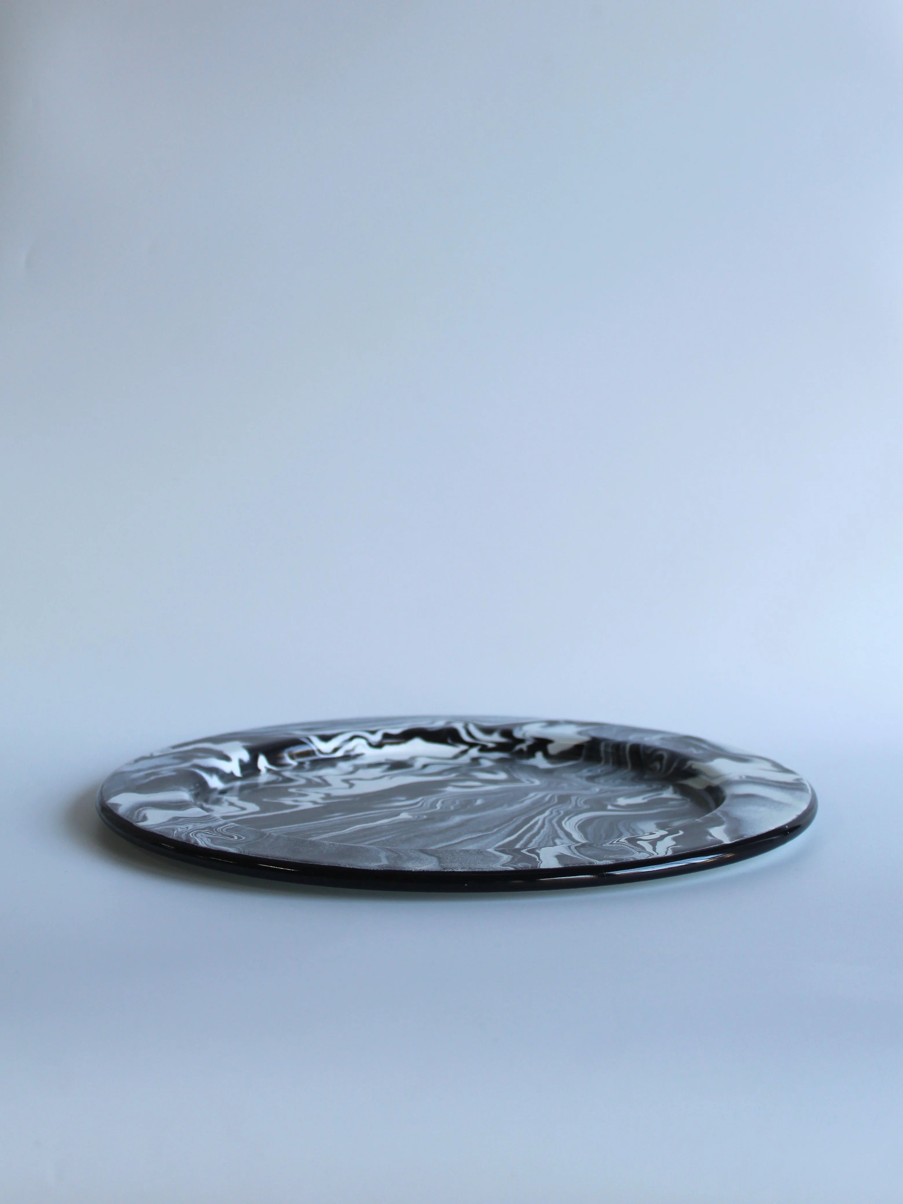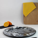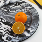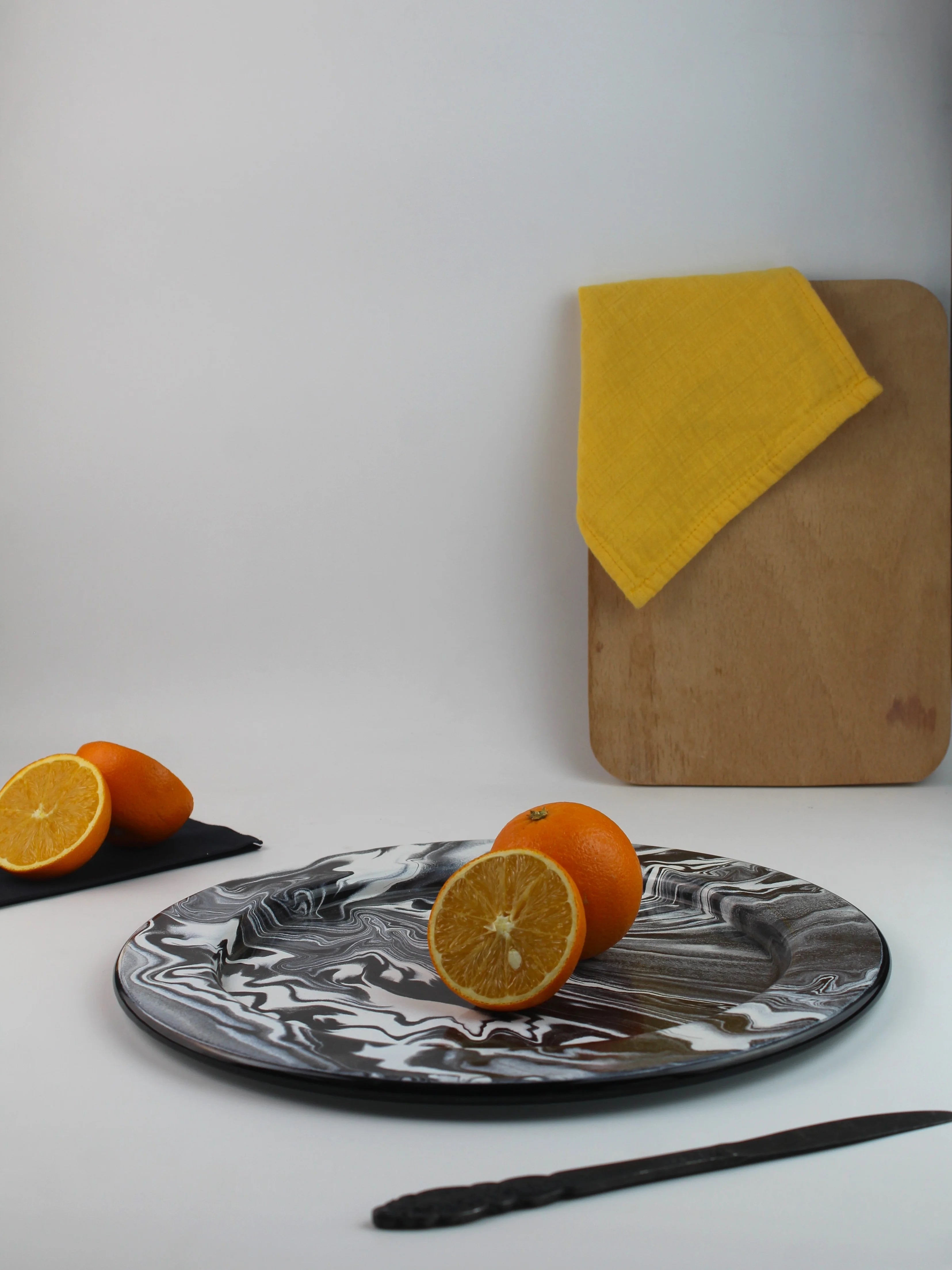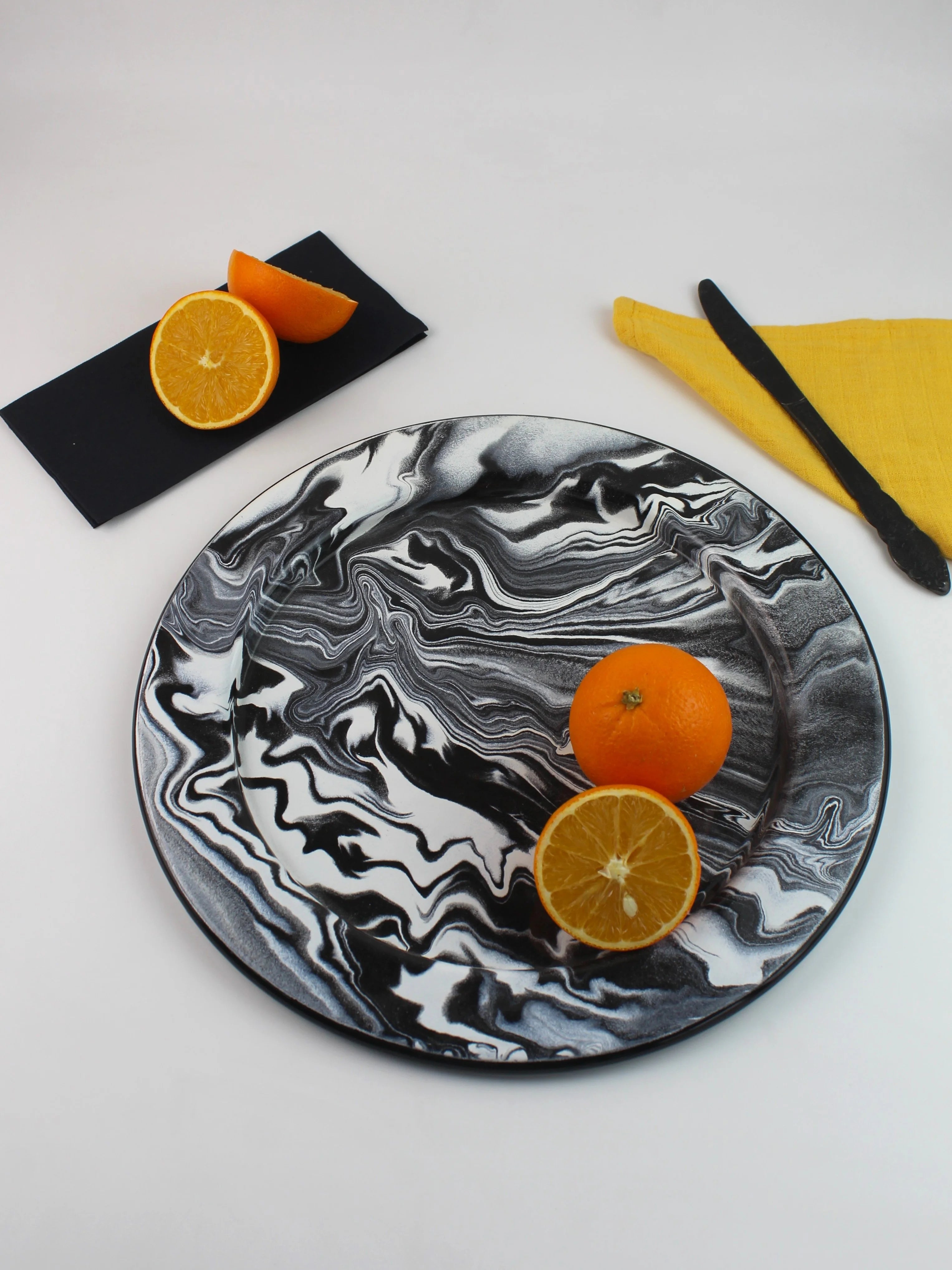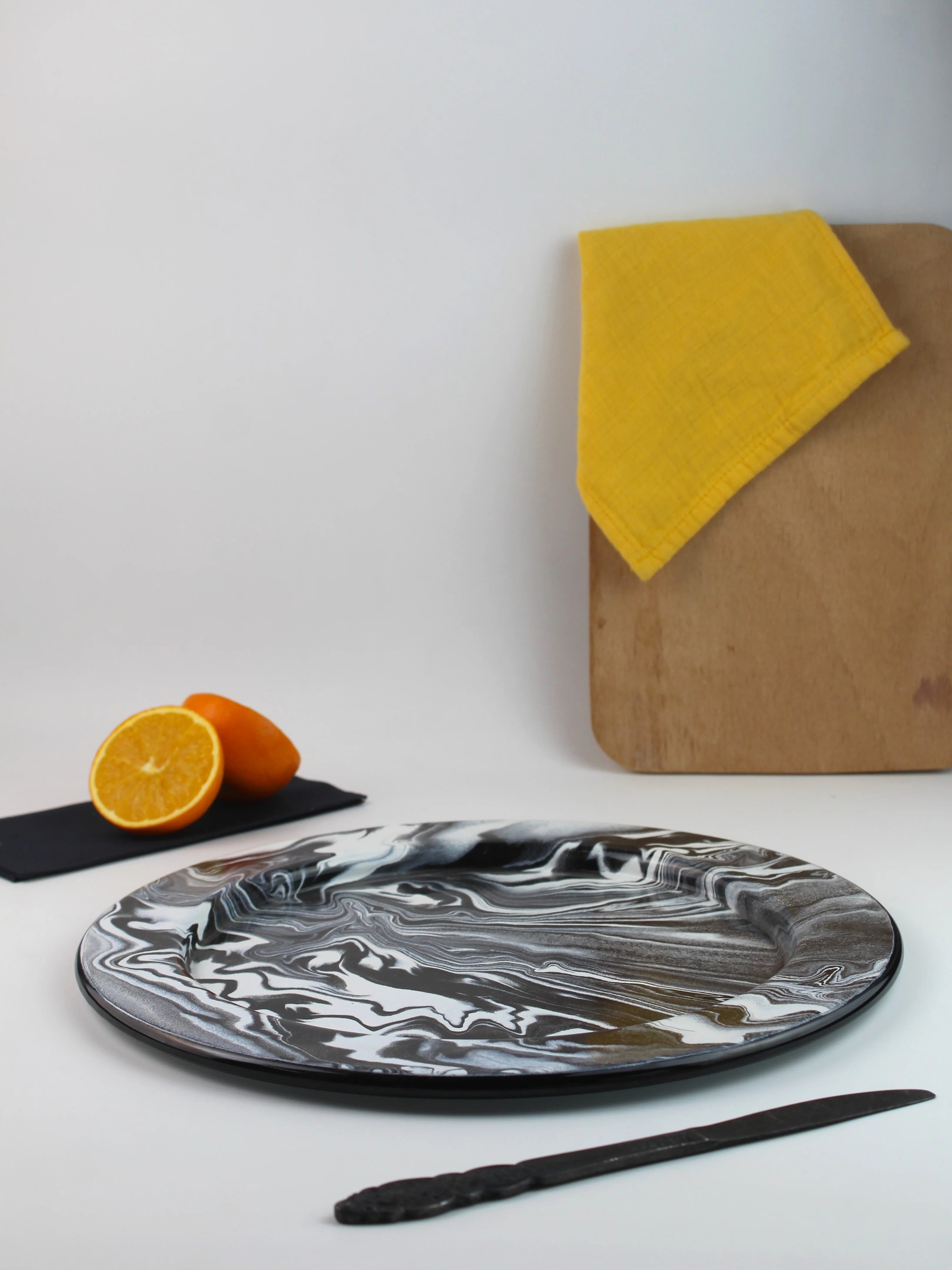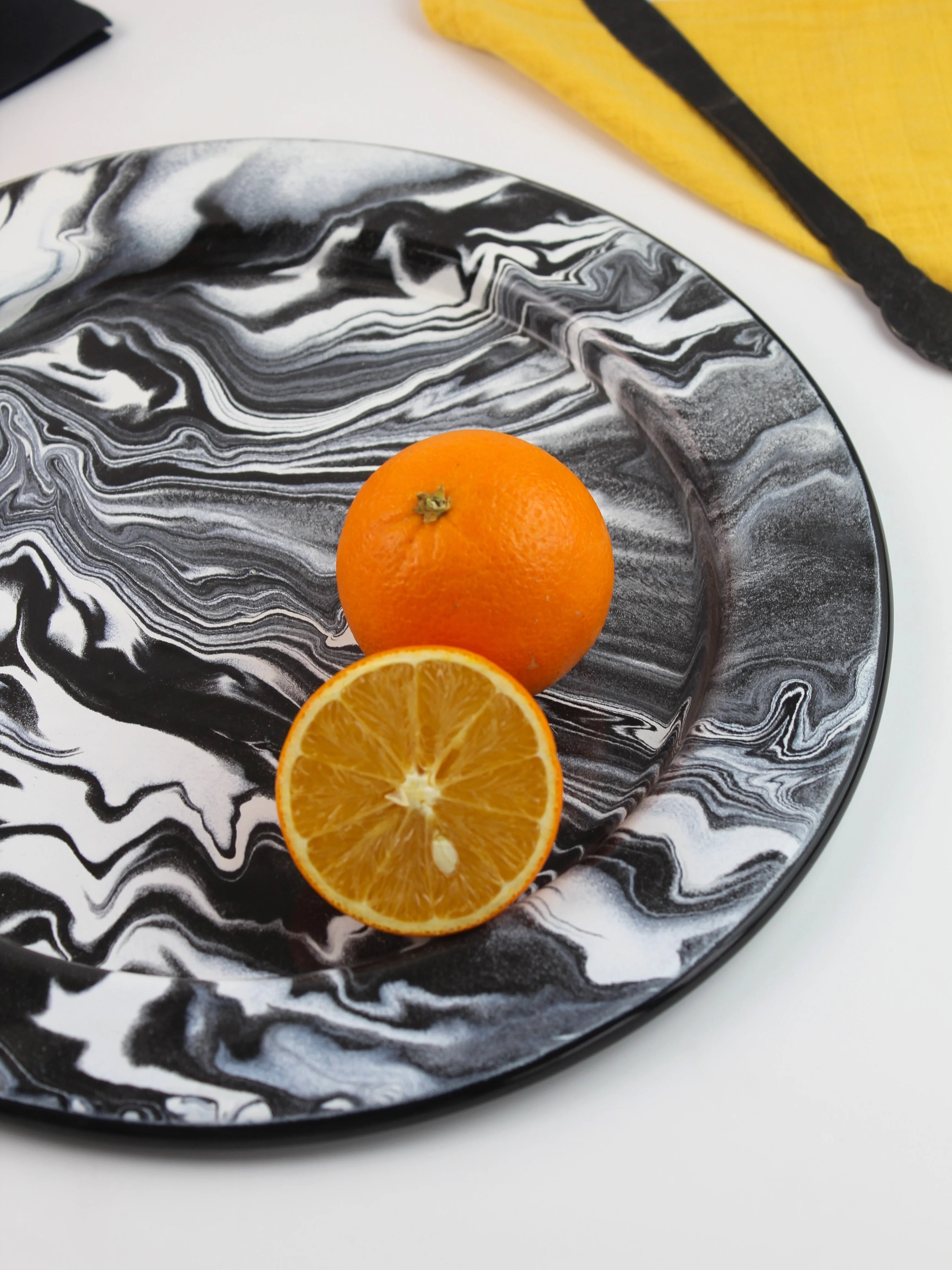 Siyah mermer desenli yüzeyi ve kontrast kenar detayı, sofralarınıza hem estetik hem de işlevsellik katar.